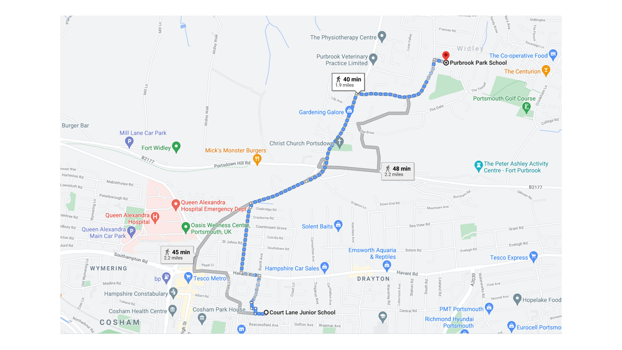 Court Lane Junior School and Purbrook Park School are highlighted on the map